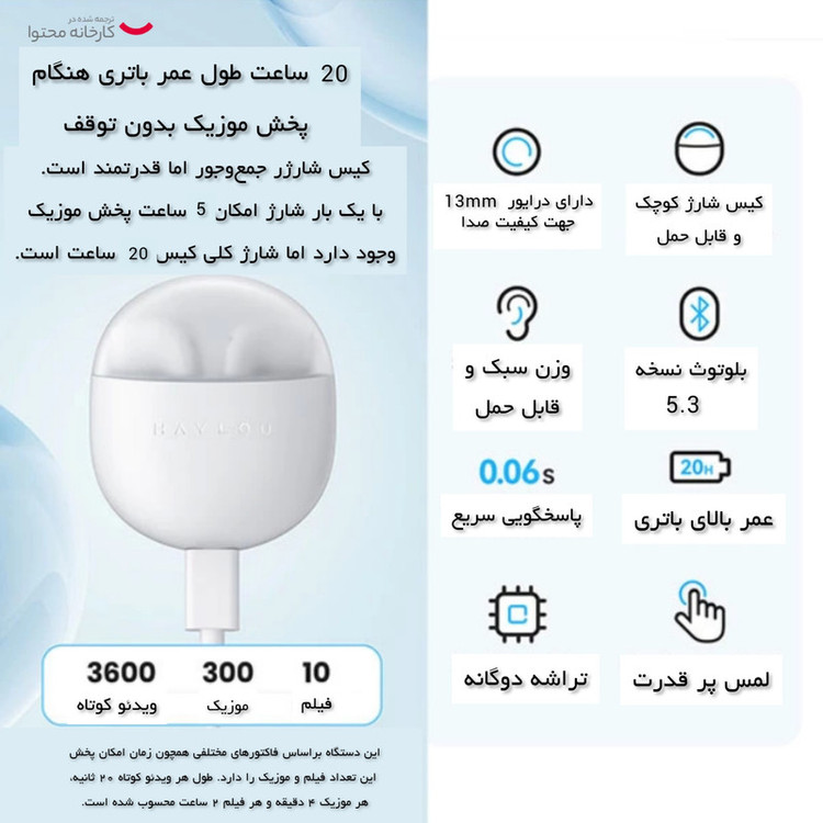 طراحی ایرفون های هندزفری بلوتوث Haylou X1 Neo به صورتSemi In-Ear است که به شکل کامل درون گوش جای میگیرند و به محض اینکه آنها را درون گوش خود میکذارید، کم شدن نویز و صداهای اضافی محیط را متوجه میشوید. وزن 3.87 گرمی هر هندزفری را نیز در نظر بگیرید که در مجموع باعث شده تا در طولانی مدت امکان استفاده از آن را داشته باشید و کمتر خسته شوید. هندزفری هایلو X1 Neo دارای قابلیت تاخیر کم بوده که این هندزفری را برای بازی کردن و فیلم دیدن مناسبتر میسازد. برای فعال سازی این حالت کافی است پنل لمسی هندزفری سمت راست را لمس کرده و به مدت 3 ثانیه نگه دارید. هندزفری هایلو X1 Neo دارای بلوتوث نسخه 5.3 است. با استفاده از این هندزفری می توان تا فاصله ده متری (بدون هیچ مانعی) بدون افت کیفیت به موسیقی گوش داد. از دیگر قابلیتهای بلوتوث نسخه 5.3 اتصال پایدارتر است. اگر گوشی شما نیز دارای نسخه 5.3 بلوتوث باشد، باتری استفاده شده از هندزفری و گوشی، کمتر خواهد بود. این ویژگی تنها زمانی رخ خواهد داد که گوشی نیز دارای نسخه 5.3 بلوتوث باشد. بر روی هندزفری X1 Neo ، پنلهای لمسی قرار داده شده است که با لمس کردن این پنلها میتوانید کاربردهای مختلفی را که هایلو برای شما در نظر گرفته است انجام داده و در کل کاربری راحتتری داشته باشید. پخش و قطع موسیقی: یک بار ضربه به یکی از پنلهای لمسی پاسخ به تماس یا قطع کردن: یک بار ضربه به یکی از پنلهای لمسی زدن موسیقی به ترک بعد: 2 بار ضربه به پنل لمسی سمت راست زدن موسیقی به ترک قبل: 2 بار ضربه به پنل لمسی سمت چپ رد تماس: دو بار ضربه به یکی از پنلهای لمسی فعال کردن حالت تاخیر کم: 3 بار ضربه به پنل لمسی گوشی سمت راست داک شارژ هندزفری بلوتوث Haylou X1 Neo دارای باتری با ظرفیت 310 میلی آمپر ساعت است. میزان شارژدهی برای ایرفون های این هندزفری جهت شنیدن موسیقی 5 ساعت و حدود 30 ساعت در مجموع با داک شارژر میرسد.باید توجه داشت که این میزان از شارژدهی با در نظر گرفتن شرایط آزمایشگاهی مورد سنجش قرار گرفته، بنابراین ممکن است که در شرایطی که شما از هندزفری استفاده میکنید، این اعداد کمی متفاوت باشد. شارژ هندزفری نیز بوسیله پورت تایپ سی موجود روی بدنه آن انجام میشود. به محض باز کردن درب کیس هایلو X1 Neo هندزفری به آخرین دستگاهی که متصل بوده، وصل میشود.