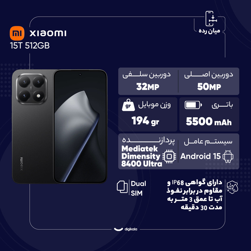 گوشی Xiaomi 15T جدیدترین گوشی از سری پرطرفدار T شیائومی هست که همیشه حرفی برای گفتن دارد. این قاتل پرچمدار ترکیب طراحی لوکس، سختافزار قدرتمند و نمایشگری خیرهکننده را در خود جای داده است. در بخش طراحی با قاب جلویی از جنس شیشه و فریم پلاستیکی در ابعادی باریک و خوشدست طراحی شده و میتوان گفت که با یک گوشی زیبا طرف هستیم. از طرفی گواهی IP68 نشان میدهد که این گوشی در برابر گرد و غبار و نفوذ آب تا عمق سه متر مقاوم است. در بخش نمایشگر، پنل AMOLED با نرخ نوسازی ۱۲۰ هرتز، پشتیبانی از تکنولوژی Dolby Vision و روشنایی خیرهکنندهی ۳۲۰۰ نیت تجربه دیداری فوقالعاده ارائه میدهد. در بخش پردازنده، تراشه Dimensity 8400 Ultra ساخت شرکت مدیاتک، بههمراه حافظههای سریع UFS 4.1 و رم ۱۲ گیگابایتی، تضمین میکند که در اجرای بازیها و برنامههای سنگین هیچگونه افت عملکردی احساس نکنیم. سیستم دوربین سهگانه ۵۰ مگاپیکسلی با لنزهای ساخت شرکت Leica و سنسور رنگ اختصاصی، کیفیت تصویربرداری 15T را به گوشیهای پرچمدار نزدیک کرده است. دوربین سلفی ۳۲ مگاپیکسلی هم با پشتیبانی از HDR10+ و فیلمبرداری 4K، یک انتخاب ایدهآل برای تولید محتوا محسوب میشود. باتری قدرتمند ۵۵۰۰ میلیآمپرساعتی و شارژ فوق سریع ۶۷ واتی، شارژدهی عالی و شارژ کامل در کمتر از یک ساعت را به همراه دارد. همه اینها در کنار سنسور اثر انگشت زیر صفحه نمایش، پشتیبانی از Wi-Fi پیشرفته و بلوتوث نسخه 6.0 ، 15T را به یکی از متعادلترین و جذابترین گوشیهای بازار تبدیل کرده است.
