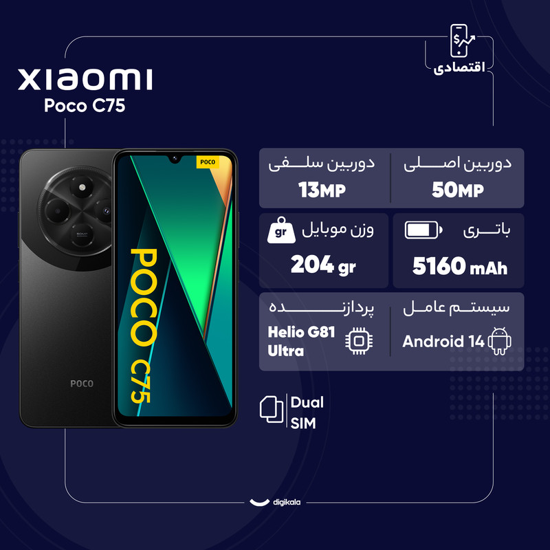 گوشی موبایل شیائومی مدل Poco C75 یکی از جدیدترین محصولات سری محبوب پوکو است که با ظرفیت ذخیرهسازی 256 گیگابایتی و هشت گیگابایت رم به کاربران عرضه شده است. این گوشی با طراحی جذاب و شیک خود، در سه رنگ مشکی، سبز و طلایی وارد ارائه شده و به دلیل بدنه شیشهای و وزن 204 گرمی، حس خوشایندی به کاربران القا میکند. همچنین، نمایشگر 6.88 اینچی این گوشی از نوع IPS LCD است که نرخ تازهسازی 120 هرتز و روشنایی 600 نیتی را برای تجربه بصری روان و واضح در اختیار کاربر قرار میدهد. در کنار این نمایشگر با کیفیت، چیپست MediaTek Helio G81 Ultra و پردازنده هشتهستهای با معماری 12 نانومتری، عملکردی سریع و پایدار را تضمین میکنند. این دستگاه مجهز به دوربین اصلی 50 مگاپیکسلی و دوربین سلفی 13 مگاپیکسلی است که امکان ثبت عکسهای خیرهکننده و فیلمبرداری با وضوح 1080p را فراهم میآورد. باتری 5160 میلیآمپر ساعتی با قابلیت شارژ سریع 18 وات، نیاز شما به انرژی را بهخوبی تأمین میکند. با رابط کاربری HyperOS بر پایه اندروید 14، تجربهای مدرن و کاربر پسند در استفاده از این دستگاه خواهید داشت. در مجموع پوکو C75 یک اقتصادی است که به مشخصات میانرده مجهز شده و به همین دلیل ارزش خرید بالایی دارد.